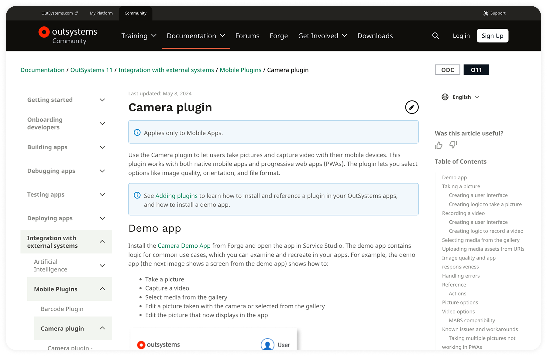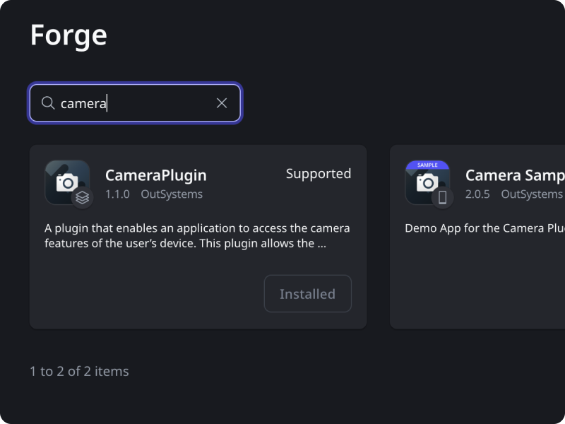 The Camera plugin is one of OutSystems' top-three Forge assets by usage. It gives developers the building blocks to add camera functionality — photo capture, gallery access, image editing — to any app built on the platform.