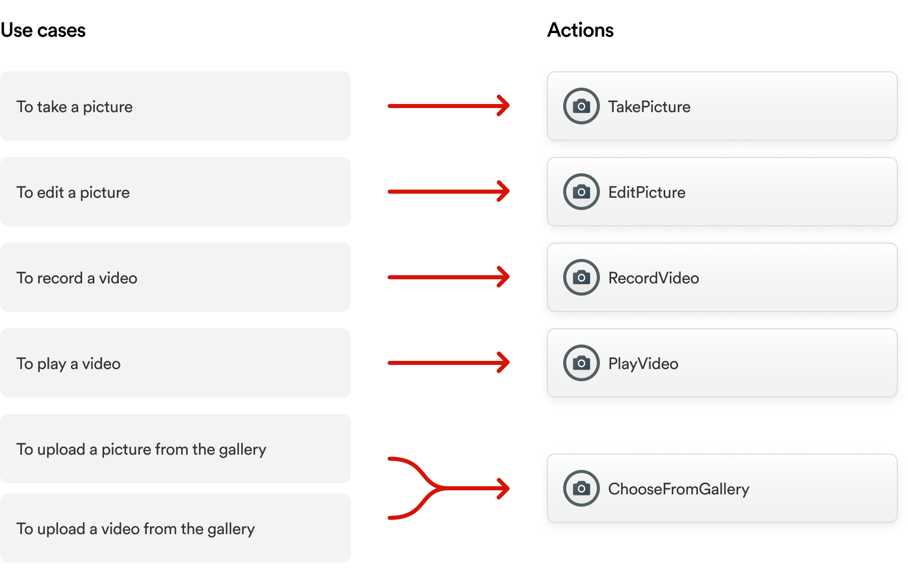 Here's what that looks like in practice. A developer needs a button that opens the device's camera to capture a photo. They attach a TakePicture Action to that button, configure a few parameters, and the native camera handles the rest. The same mental model now extends to RecordVideo, PlayVideo, and ChooseVideoFromGallery — no new paradigm to learn.