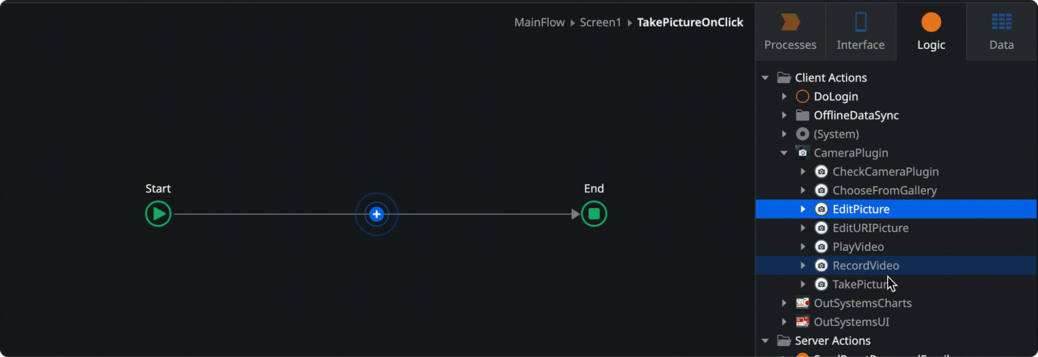 The existing Camera plugin was already structured around Actions. A developer who wanted to let users take a photo would attach a TakePicture Action to a button, configure a few parameters, and the native camera experience handled the rest. It was clean, it was consistent with how the rest of OutSystems worked, and developers had internalized it.